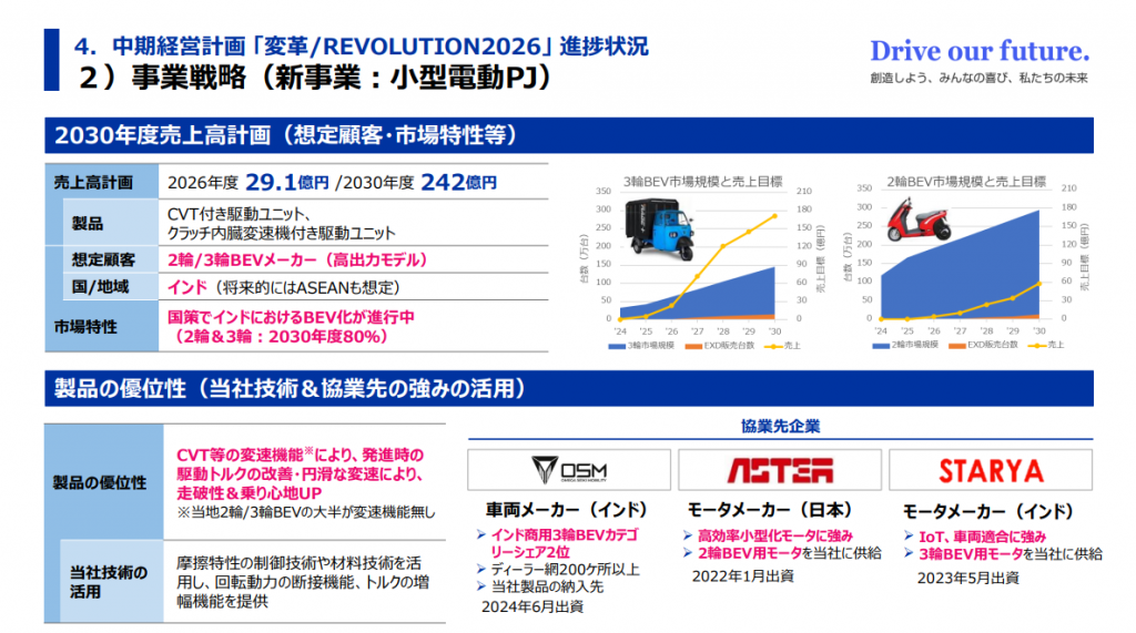 当社では今回量産を開始した3輪BEV用駆動ユニットに続き、2輪BEV用駆動ユニットの開発も進めております。政府主導による電動モビリティへのシフトが推進されているインド市場において3輪BEVカテゴリーシェア2位であるOMEGA SEIKIとの協業により当社技術を活用した高効率電動駆動ユニットを搭載した電動車開発を進め、脱炭素社会づくりをはじめ、環境負荷の最小化に貢献するとともに、お客様に新たな価値を創造し提供してまいります。