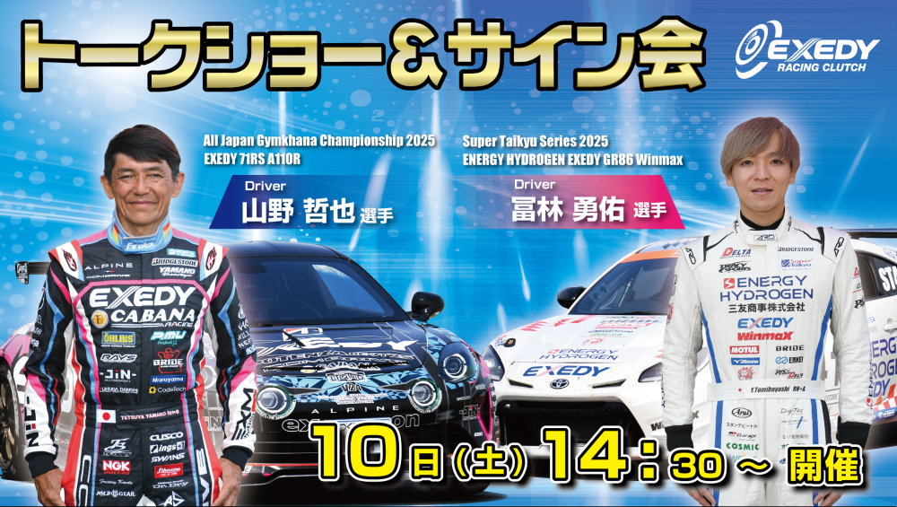 新製品の高性能クラッチ「ハイパーシングルEVO」をはじめとするレーシングクラッチを展示のほか、2025 FORMULA DRIFT JAPAN 3 でシリーズチャンピオンを獲得した中村 龍輝選手のS15 SILVIAの車両と、スーパー耐久シリーズ2025 ST-4クラスで3位を獲得したエアバスターWINMAX GR86 EXEDYの車両を展示します。