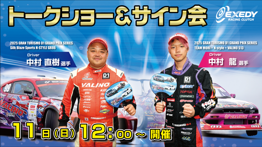 また、1月10日(土)にはS耐等のレースで活躍の山野哲也選手と冨林勇佑選手、1月11日(日)にはD1GPで活躍中の中村親子のトークショーとサイン会を開催します。