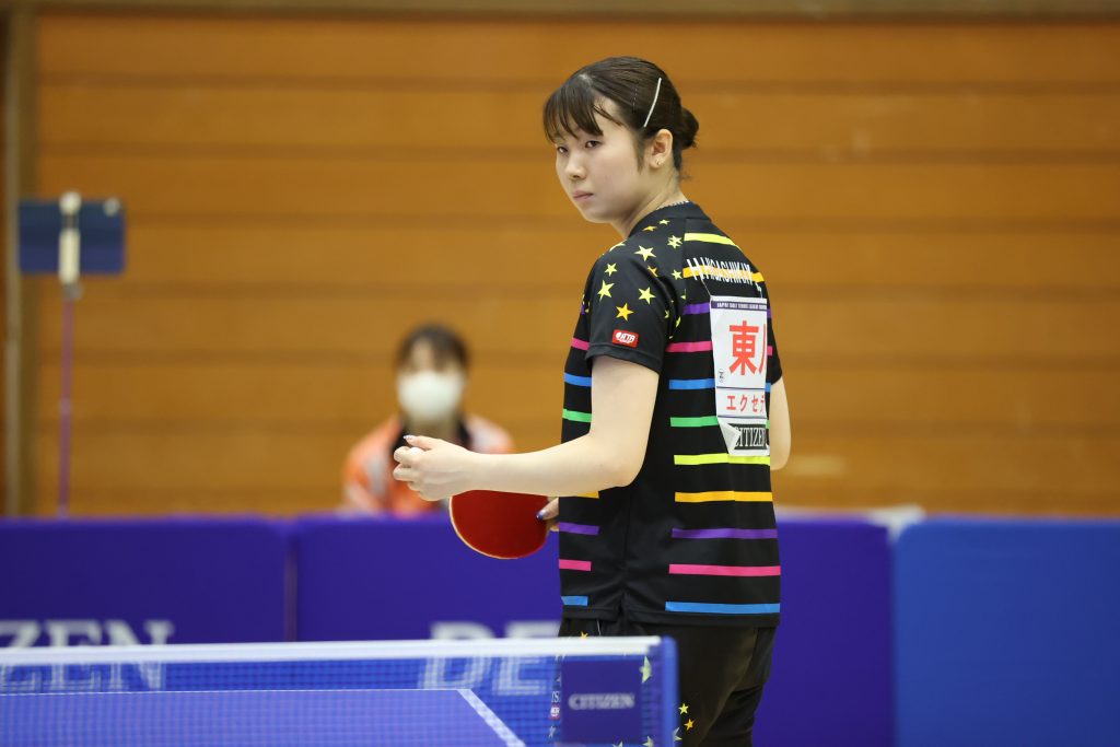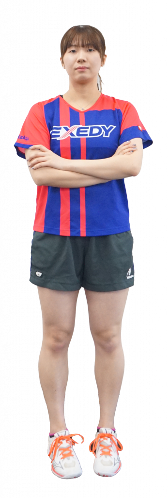 私は高長身から繰り出すフォアドライブと異質ラバーを使った独特のプレーを生かして、チームの勝利に貢献できるようにします。